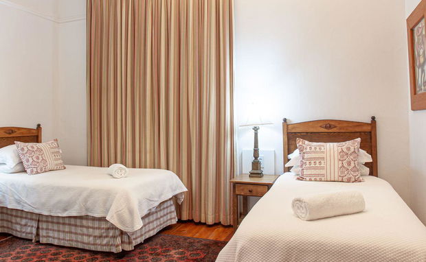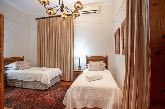 A homely room with two single beds, warm and restful in atmosphere. Amenities include a TV with Netflix, air conditioning, heating, and storage space. The bright, modern en-suite bathroom features a shower. Peaceful and comfortable for your stay.