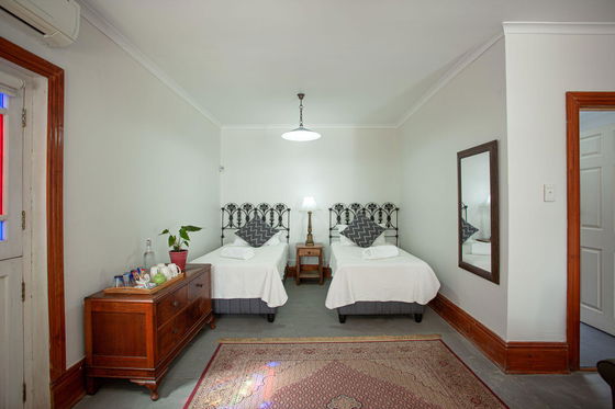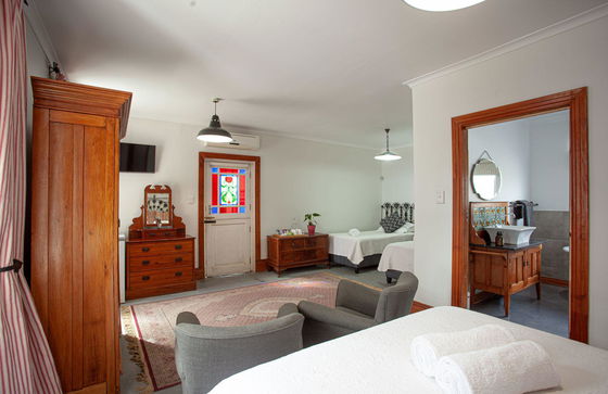 This spacious family room features a queen-size bed and two single beds, making it perfect for families or small groups. The modern en-suite bathroom includes a separate shower and a free-standing bath.